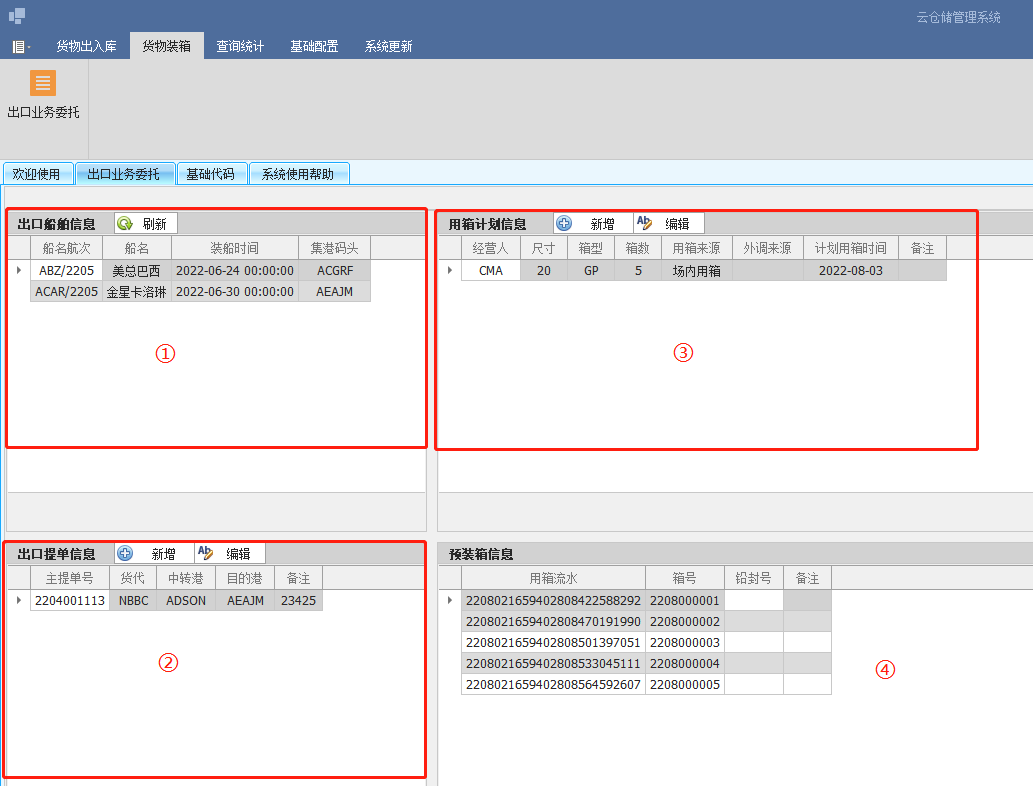 2)点击增加,录入必备的用箱信息